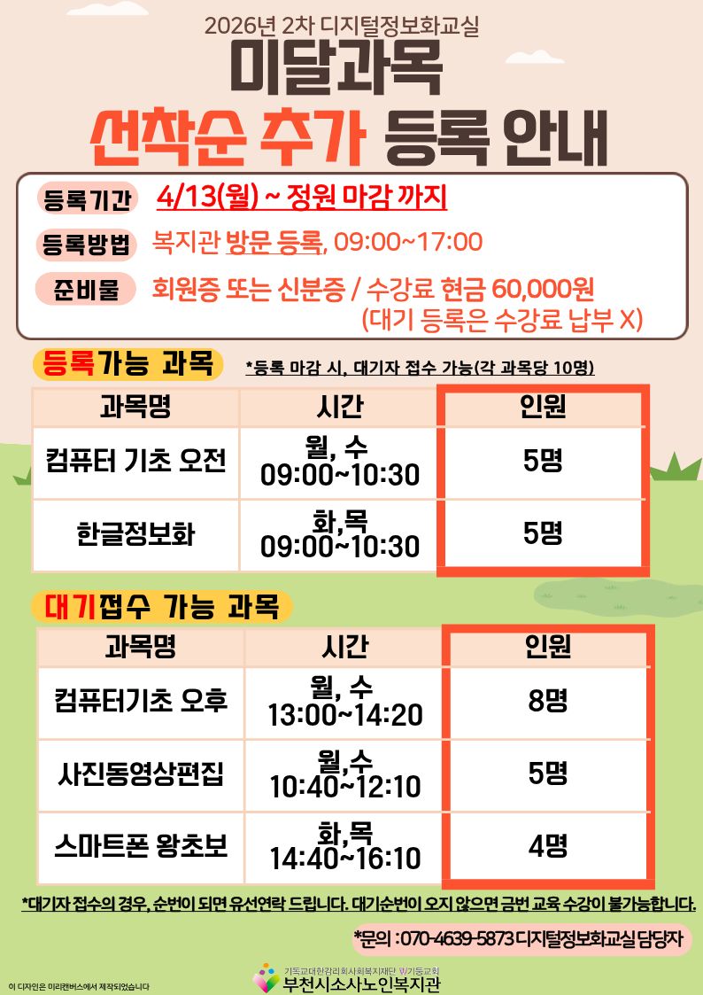 [노년사회화교육사업] 2026년 2차 디지털정보화교실 미달과목 등록