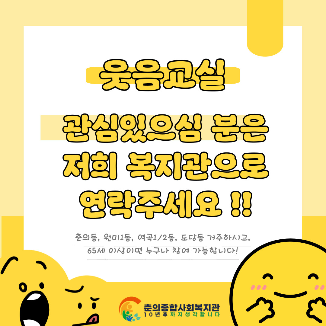 웃음을 통해 마음과 몸을 건강하게 만들고 싶은 분들은 춘의종합사회복지관으로 연락주세요 ~