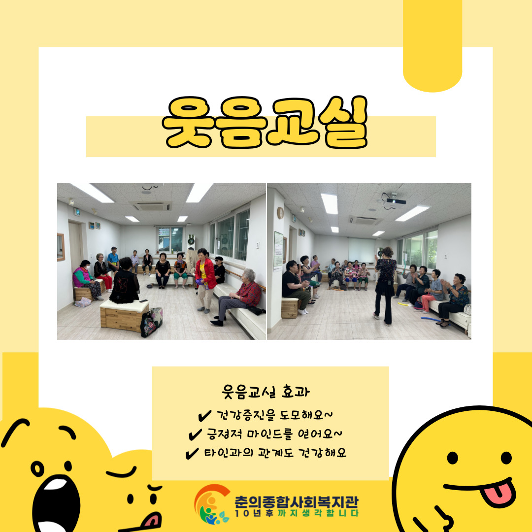 춘의종합사회복지관에서는 매월 3회, 오전 10시 ~ 11시에 즐겁고 건강한 웃음교실을 진행합니다.