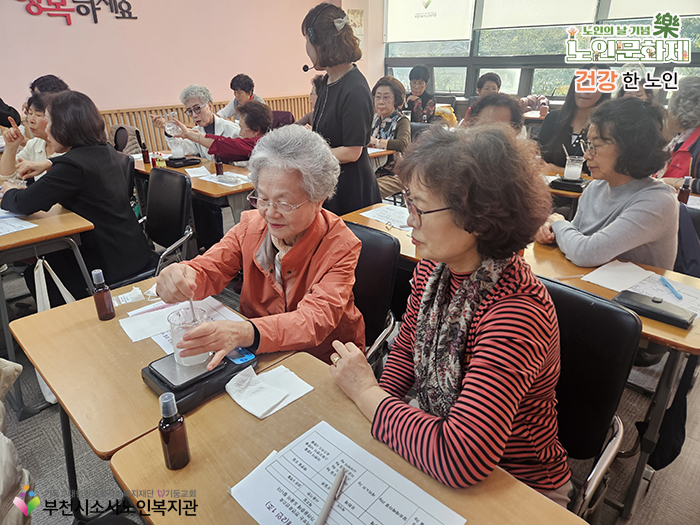 10월 23일(목) 진행된 행사에서는 구강관리 교육, 기초건강체크, 우울검사, 건강퀴즈, 인지게임, 노인의 날 특식 제공, 아로마테라피 자운고크림 만들기, 우울 예방교육 등 다양한 프로그램이 운영되어, 참여 어르신들이 즐겁게 배우고 체험하며 건강과 자기관리에 대해 돌아볼 수 있는 시간이 마련되었습니다.