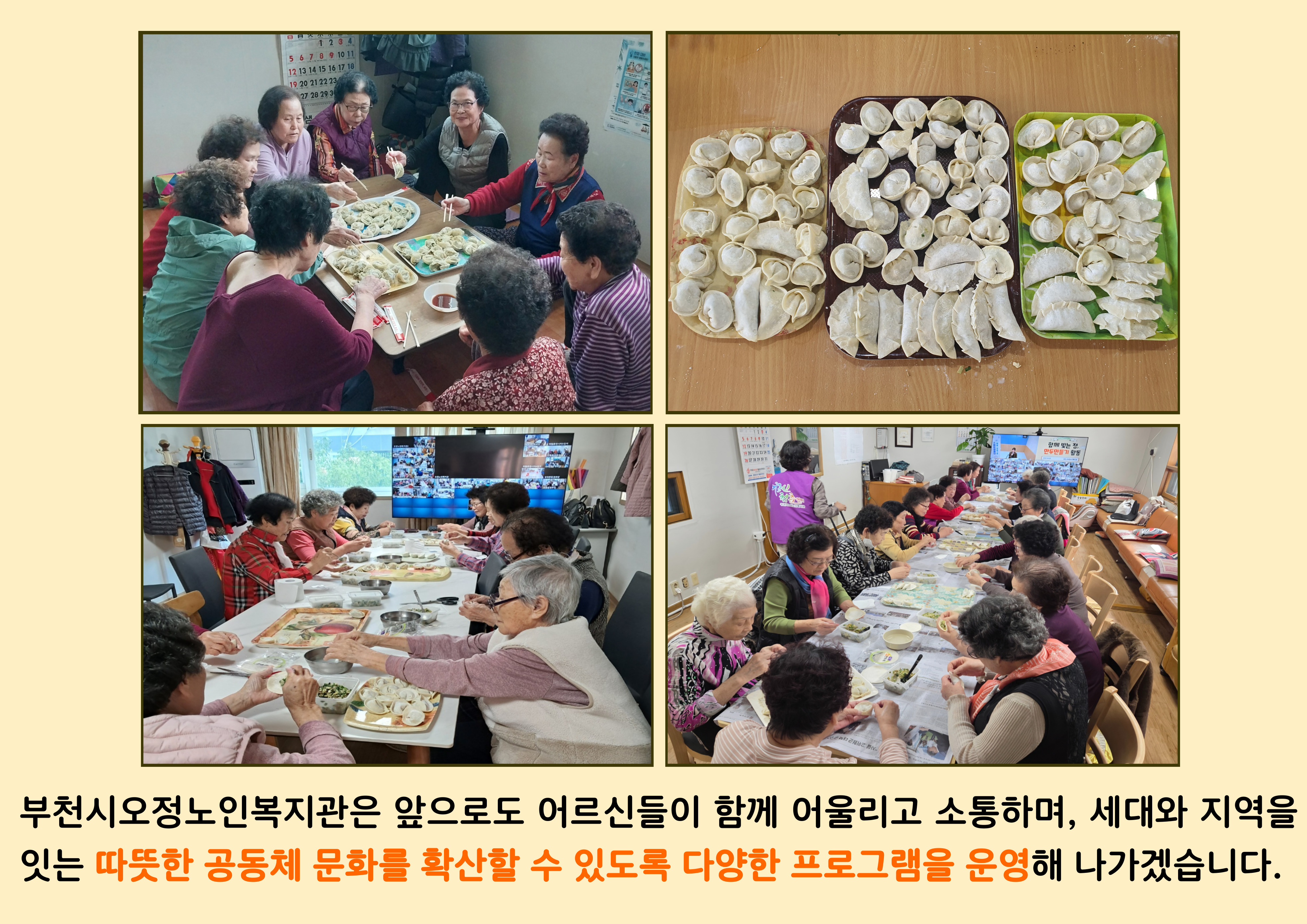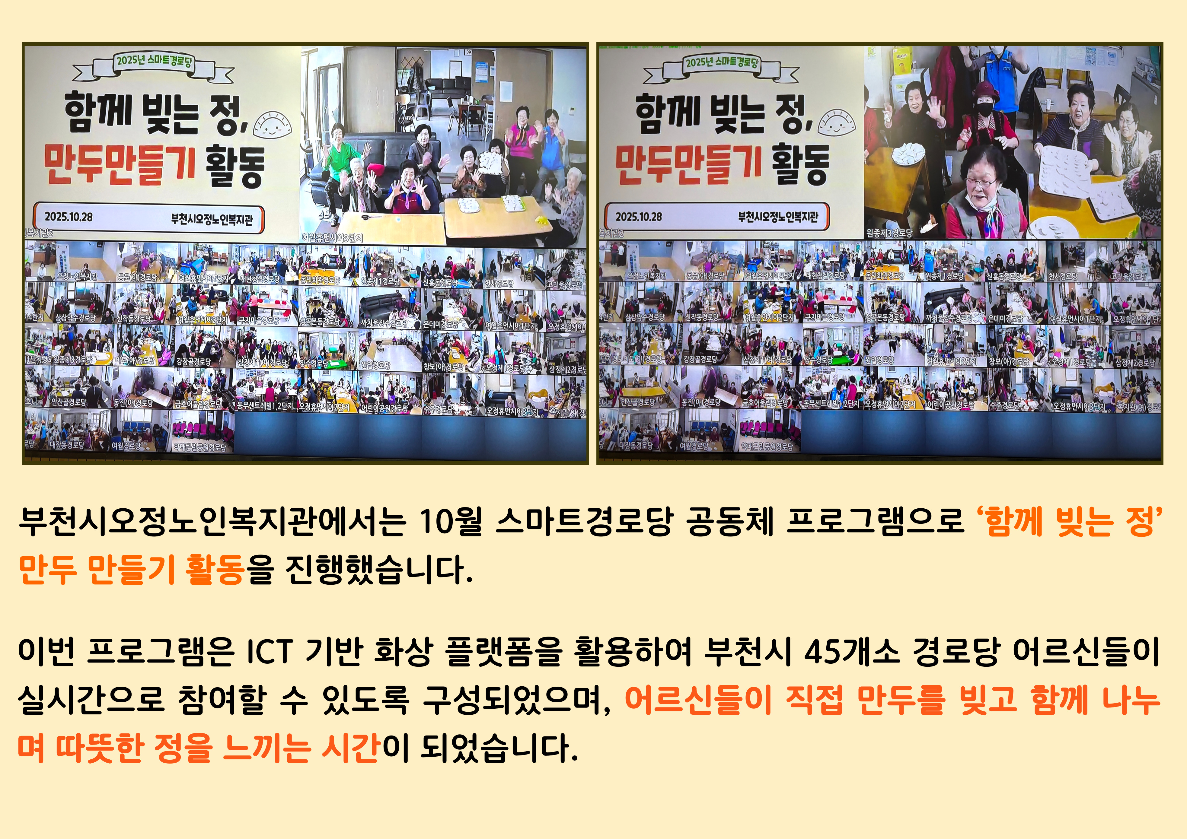 이번 프로그램은 ICT 기반 화상 플랫폼을 활용하여 부천시 45개소 경로당 어르신들이 실시간으로 참여할 수 있도록 구성되었으며, 어르신들이 직접 만두를 빚고 함께 나누며 따뜻한 정을 느끼는 시간이 되었습니다.