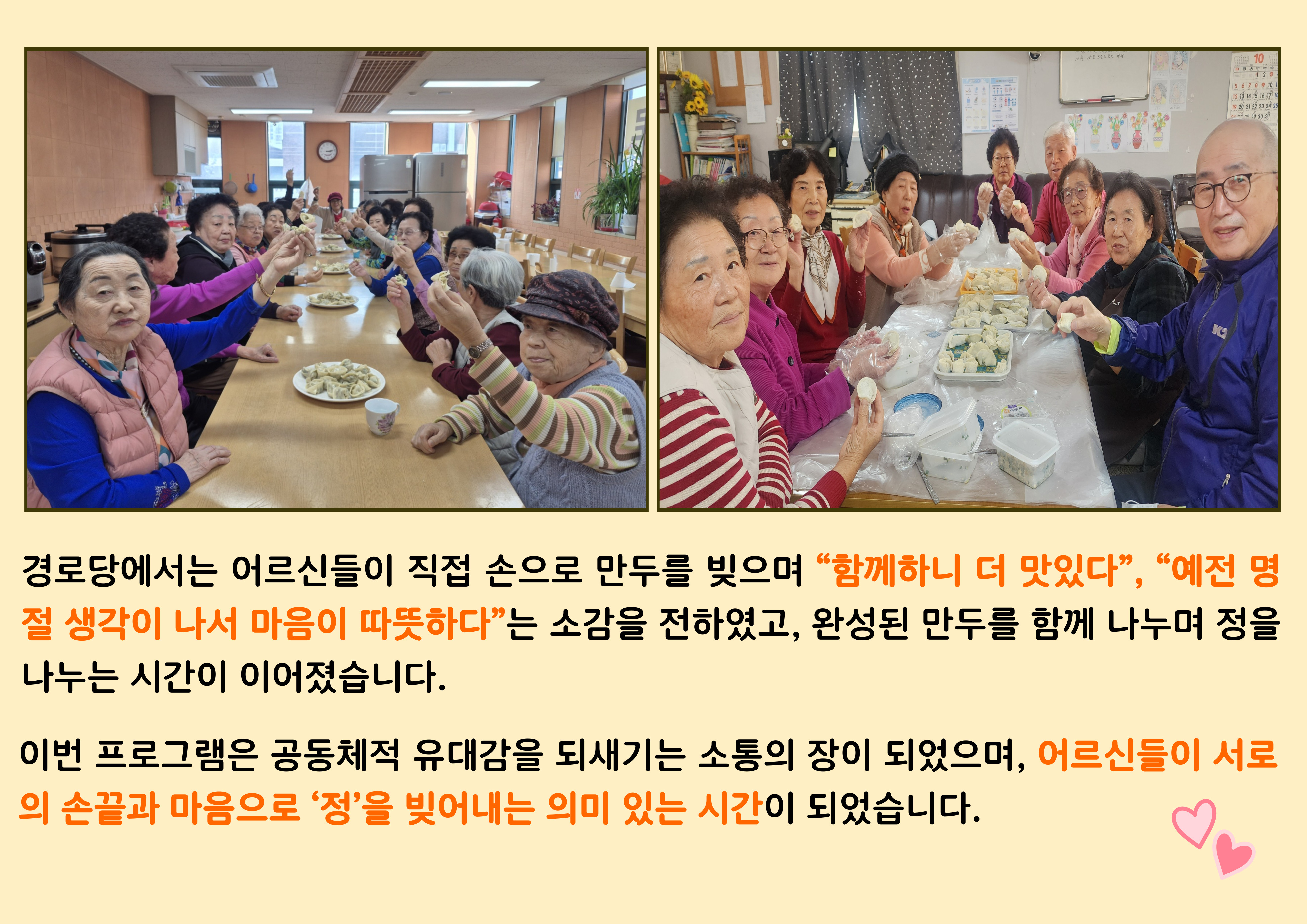 어르신들은 직접 손으로 만두를 빚으며 “함께하니 더 맛있다”, “예전 명절 생각이 나서 마음이 따뜻하다”는 소감을 전하였고, 완성된 만두를 함께 나누며 정을 나누는 시간이 이어졌습니다.