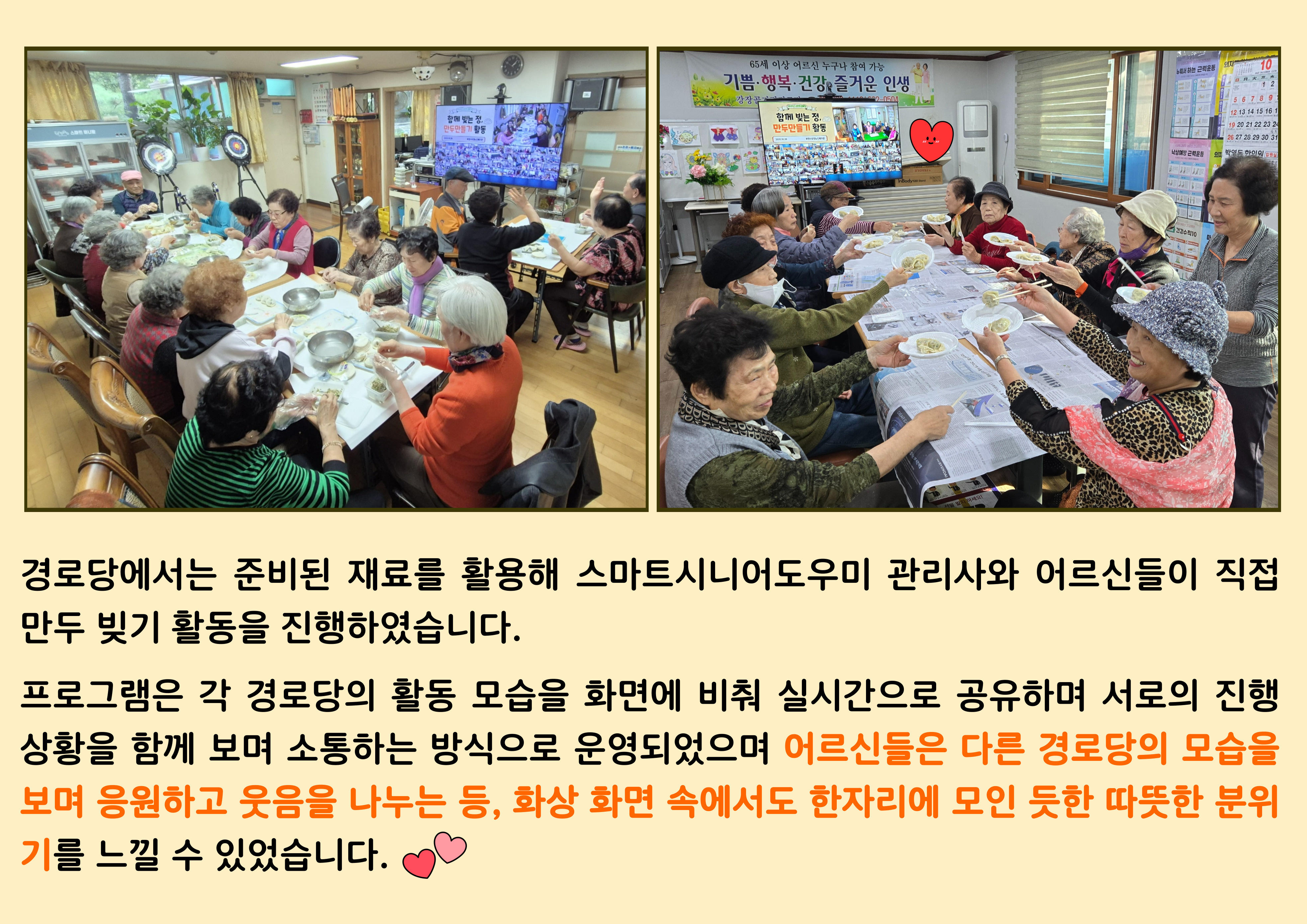 -내용 : 스마트경로당 공동체 프로그램 ‘함께 빚는 정’ 만두만들기 활동 진행
