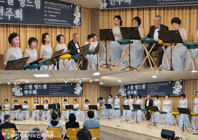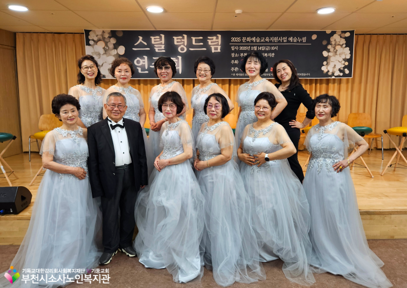 부천시소사노인복지관에서는 한국문화예술교육진흥원의 지원을 받아, 2025 문화예술교육지원사업 예술누림-텅드럼 프로그램을 통해 어르신들과 특별한 시간을 만들어 왔습니다. 그 여정의 결실로, 11월 14일(금)에 자서전 전시회 & 텅드럼 연주회를 진행했습니다.