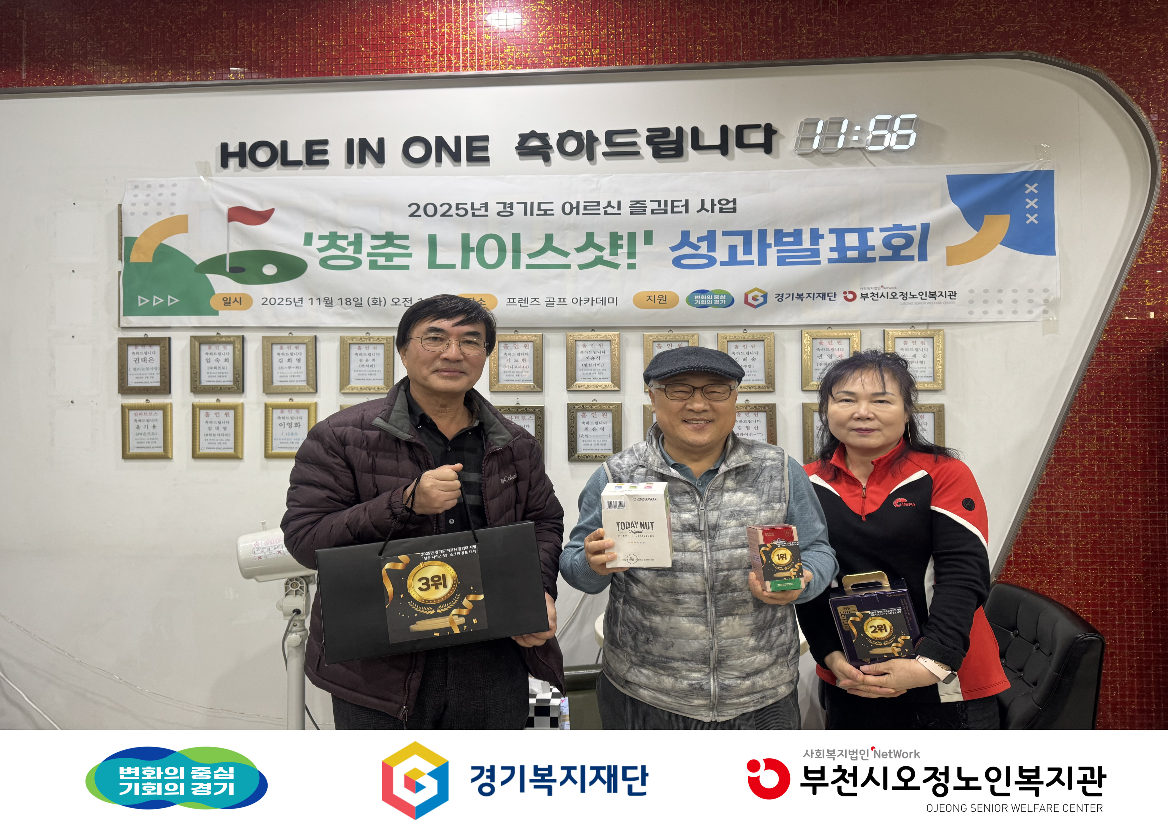 평생교육팀에서는 6월부터 11월까지 경기도 어르신 즐김터 사업으로 ‘청춘 나이스샷!’ 골프 프로그램을 진행했습니다. 전문 강사와 함께한 골프 레슨, 개인 역량 강화를 위한 연습, 어르신 주도의 골프 동아리 활동까지 총 6개월간 알찬 활동이 이어졌습니다. 프로그램의 성과공유회로 스크린 골프 대회를 개최하여 그동안 갈고닦은 실력을 마음껏 뽐내는 시간을 가졌습니다. 경기 결과 1·2·3위도 선정하여 성과를 함께 축하했습니다. 앞으로도 어르신들이 건강하게 즐길 수 있는 여가 활동을 확대하고, 지속적인 동아리 활동을 통해 관계가 이어질 수 있도록 지원하겠습니다. -일시: 11월 18일 (화) 10:00~14:00 -장소: 프렌즈골프아카데미 -대상: 참여자 10명 -내용: 스크린골프대회 진행 -문의: 복지1과 평생교육팀 032-683-9290