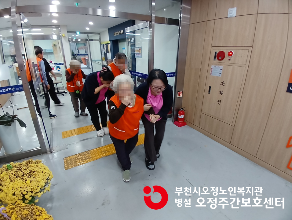 오정주간보호센터에서는 11월 21일(금) 센터 내에서 어르신들과 화재 및 재난 발생에 대한 대피요령 습득을 위한 하반기 재난대피 훈련을 진행하였습니다.