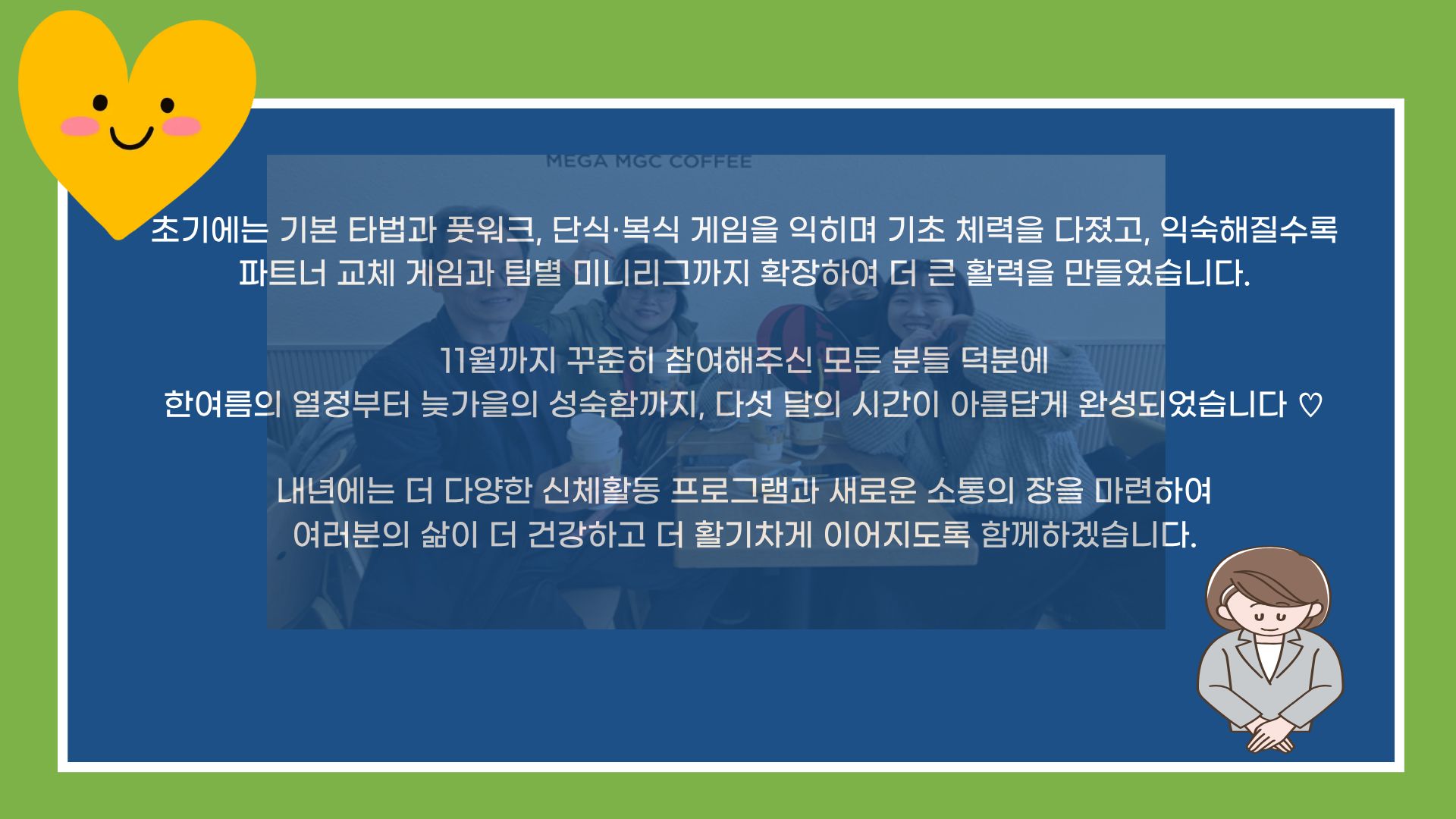 여러분이 보여주신 열정과 웃음은 프로그램을 더욱 풍성하게 만들었고, 서로에게 든든한 힘이 되었습니다.