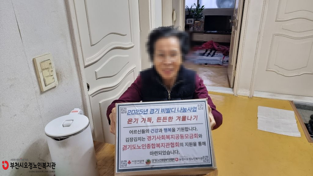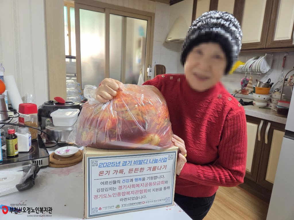 안녕하세요, 부천시오정노인복지관입니다. 부쩍 추워진 날씨에 어르신들의 건강이 염려되는 요즘, 우리 복지관에 마음 따뜻해지는 소식이 도착했습니다. 지난 12/5(금), 경기사회복지공동모금회와 경기도노인종합복지관협회의 소중한 후원을 통해 우리 어르신들을 위한 김장김치 지원 사업을 진행했습니다. 정성이 가득 담긴 김장김치 10kg은 노인맞춤돌봄서비스를 이용하시는 어르신들께 소중히 전달되었습니다. 김치를 전달받으신 한 어르신께서는 "올겨울 반찬 걱정을 덜었다"며 환한 미소로 고마움을 전하셨습니다. 어르신들의 든든한 겨울 식탁을 위해 따뜻한 손길을 내어주신 경기사회복지공동모금회와 경기도노인종합복지관협회 관계자분들께 깊은 감사를 드립니다. 앞으로도 저희 복지관은 어르신들이 지역사회의 온기 속에서 건강하게 지내실 수 있도록 최선을 다하겠습니다. -문의: 복지2과 노인맞춤돌봄서비스 032)679-4100