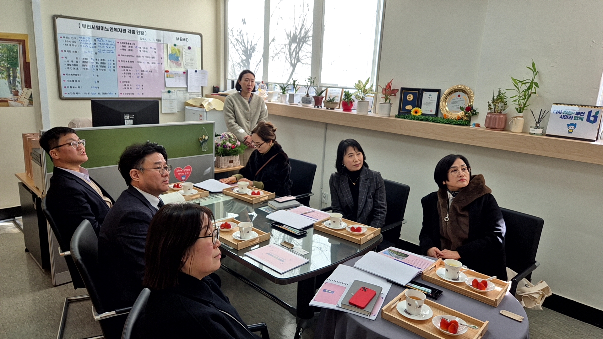 지난 1월 1일자 부천시 인사이동에 따라 노인복지과로 발령받은 고선자 노인복지과장과 송수남 노인여가복지팀장을 비롯한 관계자 4명이 본 기관을 방문해 주셨습니다.