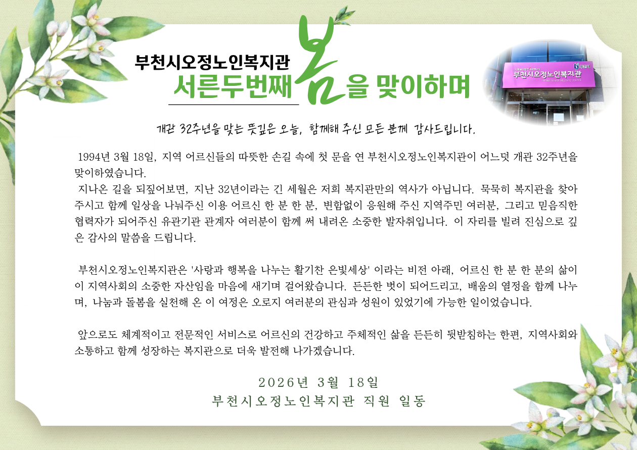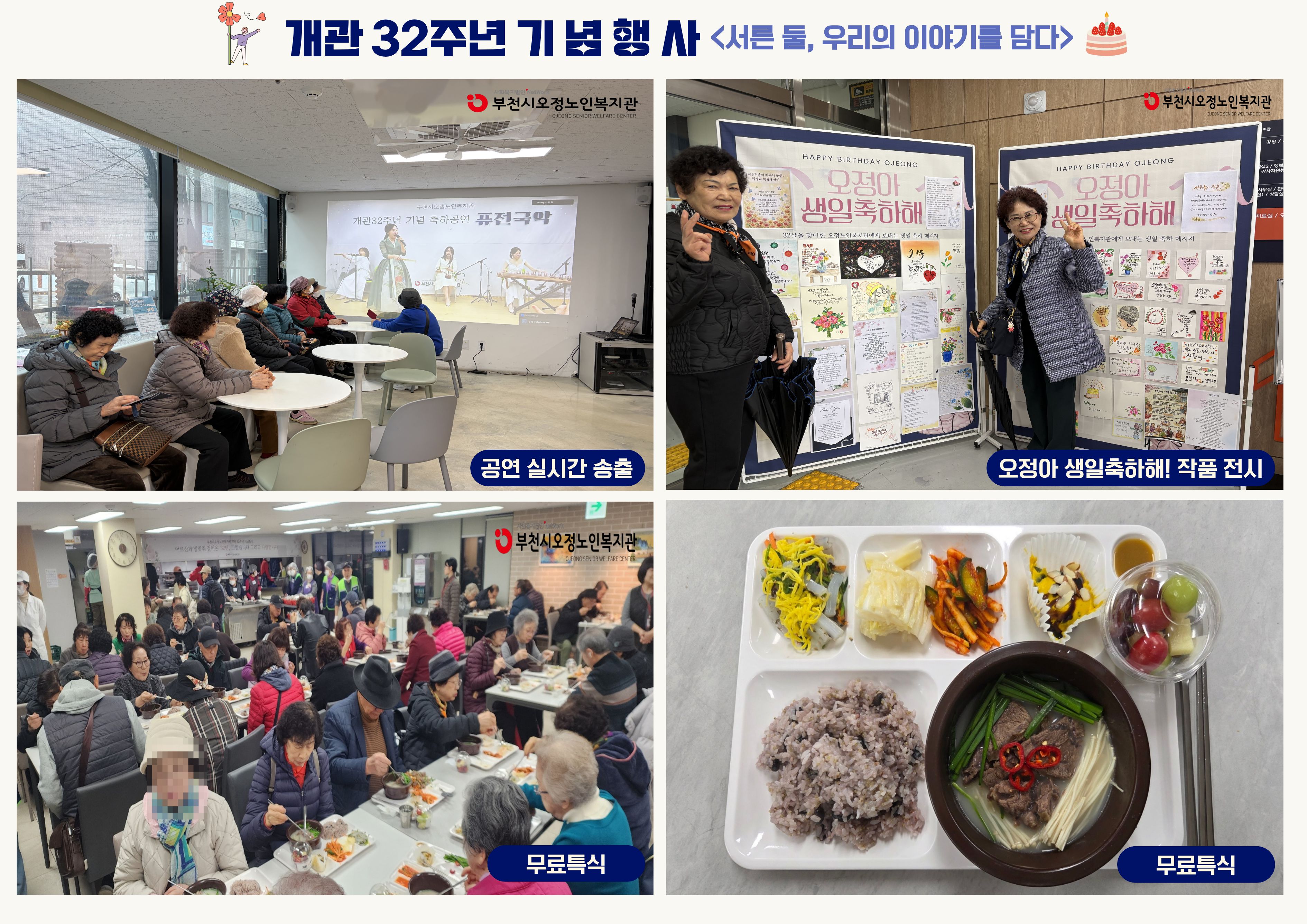 부천시오정노인복지관은 3월 18일(수), 개관 32주년을 맞아 「서른둘, 우리의 이야기를 담다」 행사를 진행하였습니다.