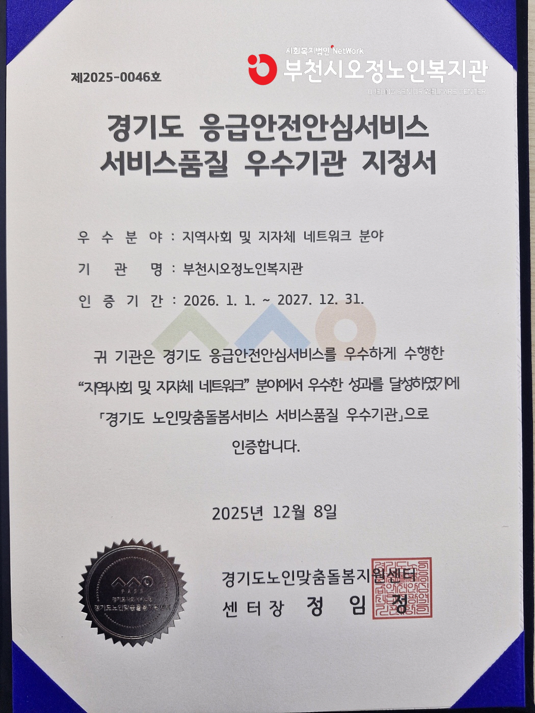 이에 따라 우수 수행기관으로서 현판식 전달이 진행되었으며 기관의 우수한 성과를 공식적으로 인정받는 뜻깊은 시간을 가졌다. 앞으로도 부천시오정노인복지관은 응급안전안심서비스 우수기관으로서 지역사회 및 지자체와의 긴밀한 협력체계를 바탕으로 서비스 이용 어르신들의 안전을 더욱 촘촘히 지켜나가는 기관으로 지속적으로 발전해 나가겠다.