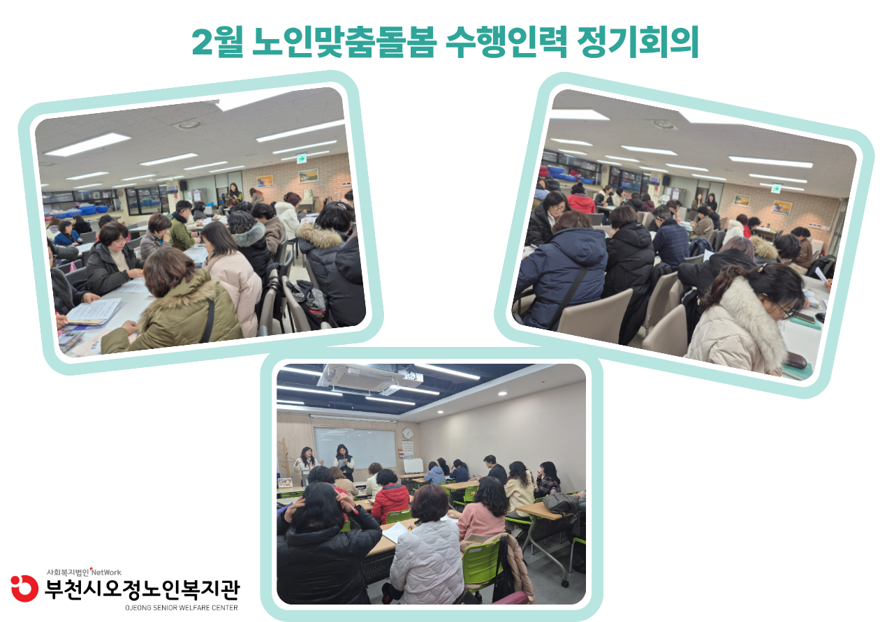 부천시오정노인복지관 노인맞춤돌봄사업에서는 2026년 2월 5일(목), 2월 19일(목), 2월 26일(목) 수행인력 정기회의를 진행하였습니다.