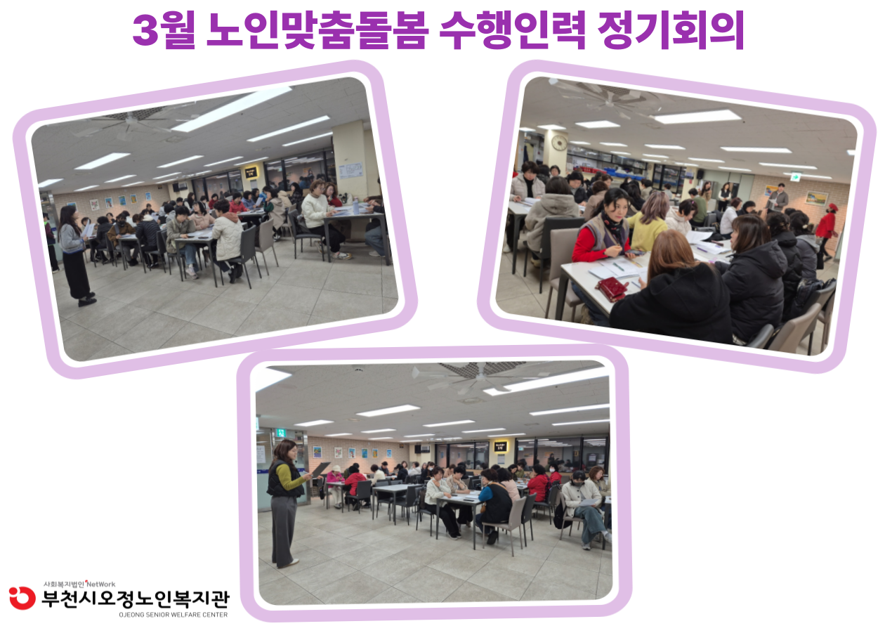부천시오정노인복지관 노인맞춤돌봄사업에서는 2026년 3월 5일(목), 3월 12일(목), 3월 19일(목), 3월 26일(목) 수행인력 정기회의를 진행하였습니다.